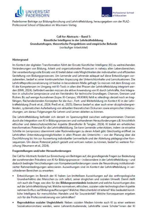 Der fünfte Band der „Paderborner Beiträge zur Bildungsforschung und Lehrkräftebildung“ setzt an aktuellen Fragen im Bereich KI in der Lehrkräftebildung an. Ziel des Bandes ist es, ein interdisziplinäres Forum für die Darstellung und Diskussion von theoretisch-konzeptionellen Zugängen und empirischen Forschungsbefunden zu KI im Kontext der Lehrkräftebildung zu bieten. Der Band soll zur Systematisierung bestehender Ansätze beitragen, Forschungsdesiderate aufzeigen und Perspektiven für die Gestaltung von Professionalisierungsprozessen eröffnen. Willkommen sind Beiträge aus allen beteiligten Fachdisziplinen bzw. -domänen.